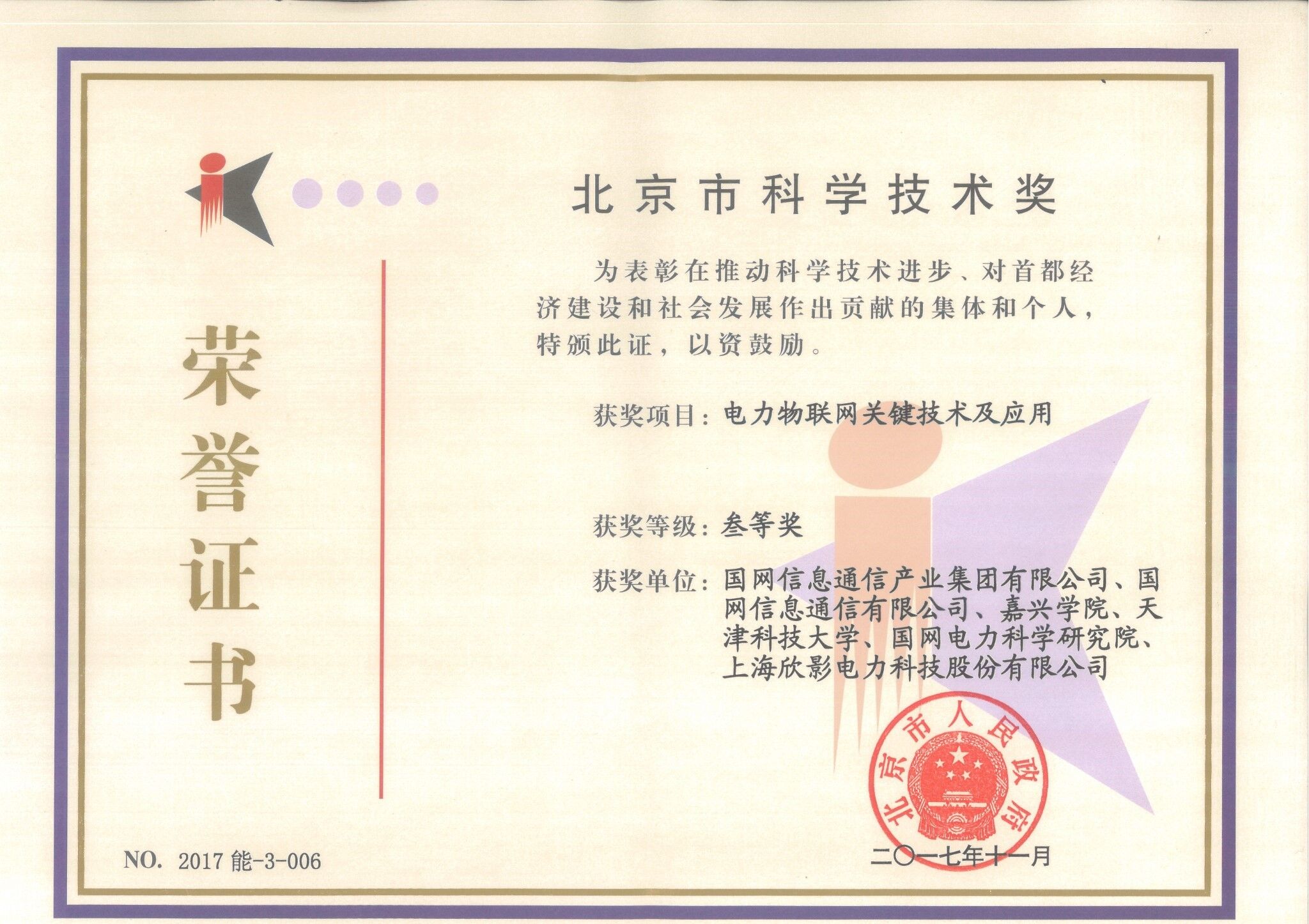 北京市科學(xué)技術(shù)獎(jiǎng)榮譽(yù)證書(shū)