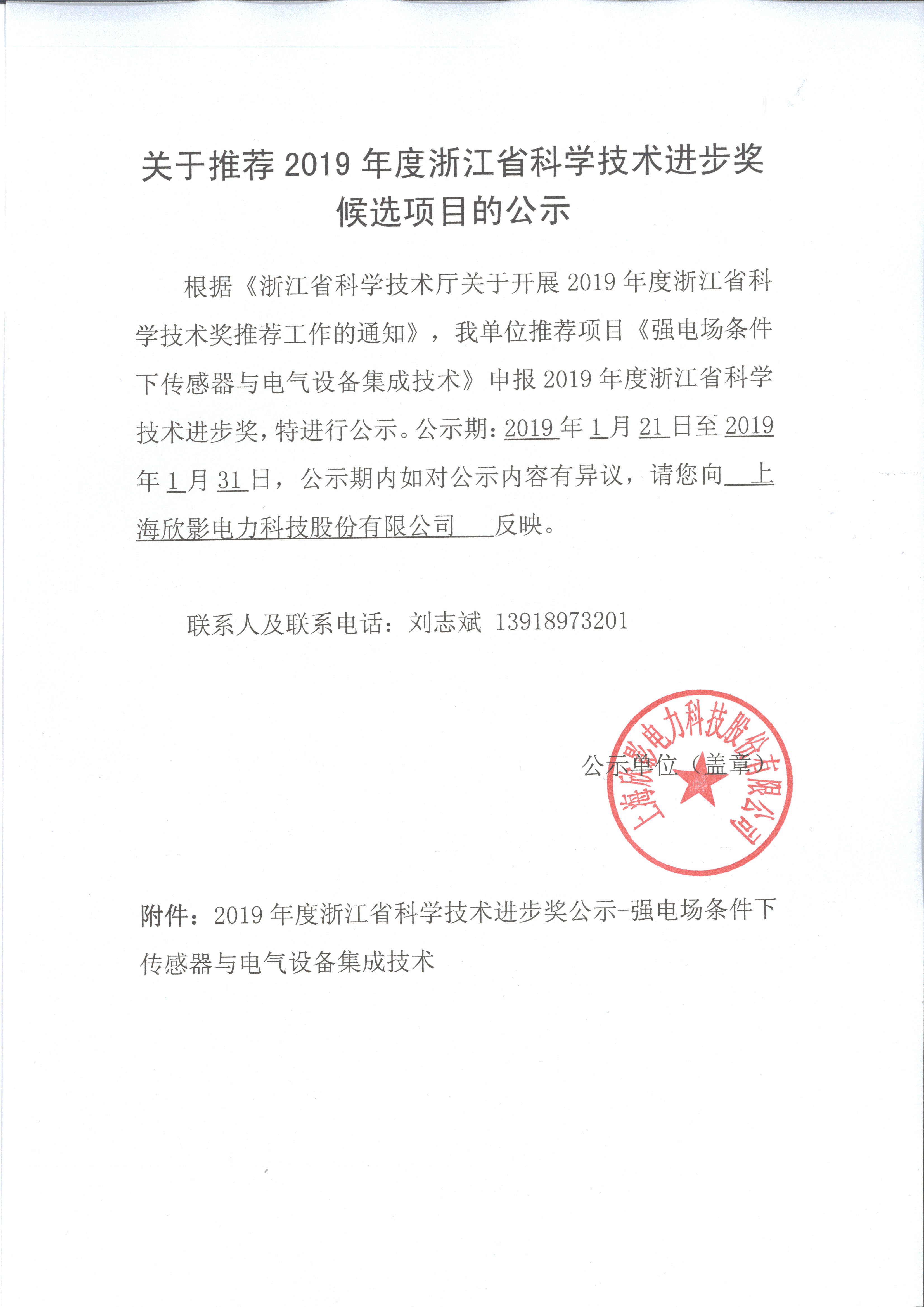 我公司參與“強電場條件下傳感器與電氣設備集成技術”申報2019年浙江省科學技術進步獎——特此公示